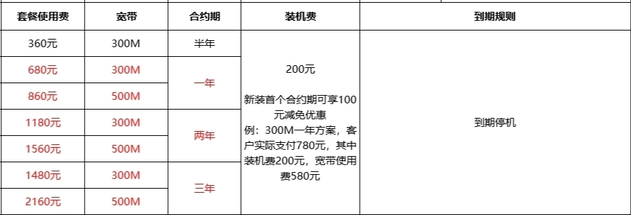 追求性价比不想经常换宽带的小伙伴可以直接选择3年的套餐,性价比更高,更省心!活动一:新装首个合约期可享100元减免优惠!所有档位都可以享受。活动二:两年套餐补贴100元装机费,三年套餐补贴200元装机费。300M三年宽带补贴到手仅需1380元(包安装),500M三年宽带补贴到手仅需2060元(包安装)。300M两年宽带补贴到手1180元(包安装),500M宽带补贴到手仅需1560元(包安装)。