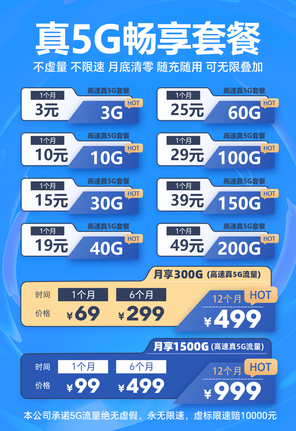 目前我们的产品套餐主要分成两大类,一类就是1500G大流量每月可以包月也可以包年的,第二类就是几十到几百G不等的小流量无限叠加的版本。