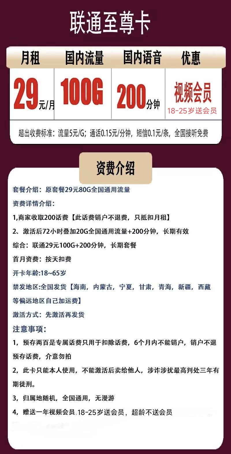 ## 📱 联通至尊卡 – 29元100G+200分钟长期套餐