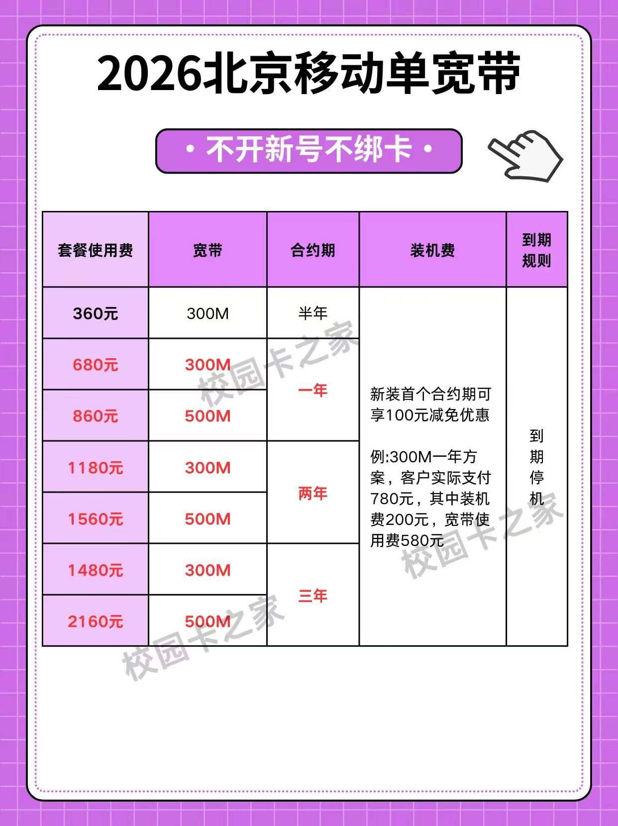 北京移动单宽带两年补贴100元安装费
